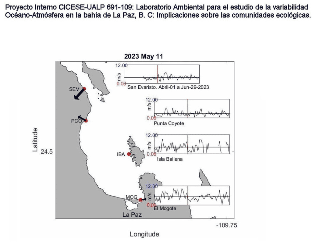 La animación presenta el comportamiento del viento (Dirección y rachas de viento) en cada una de las 4 Estaciones Meteorológicas durante el invierno de 2023 (01-enero al 30 de marzo) en la Bahía de La Paz. La punta de la flecha del vector indica la dirección hacia donde se dirige el viento